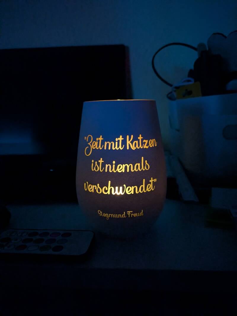 Auf Kundenwunsch ist dieses hübsche Windlichtglas entstanden, verziert mit einem kleinen Text und einem süßen Katzenmotiv, das die Weihnachtszeit erhellen wird.