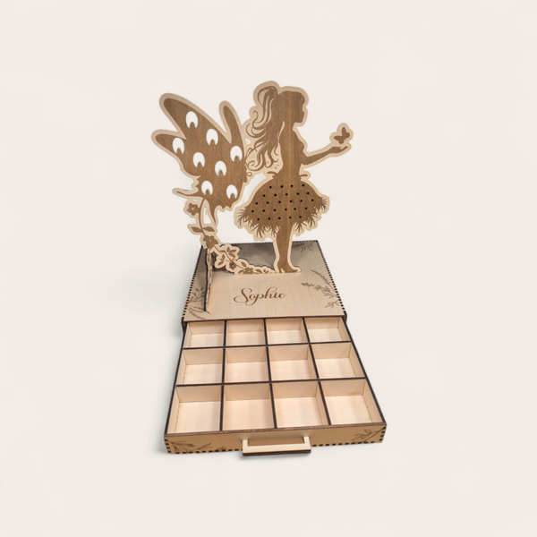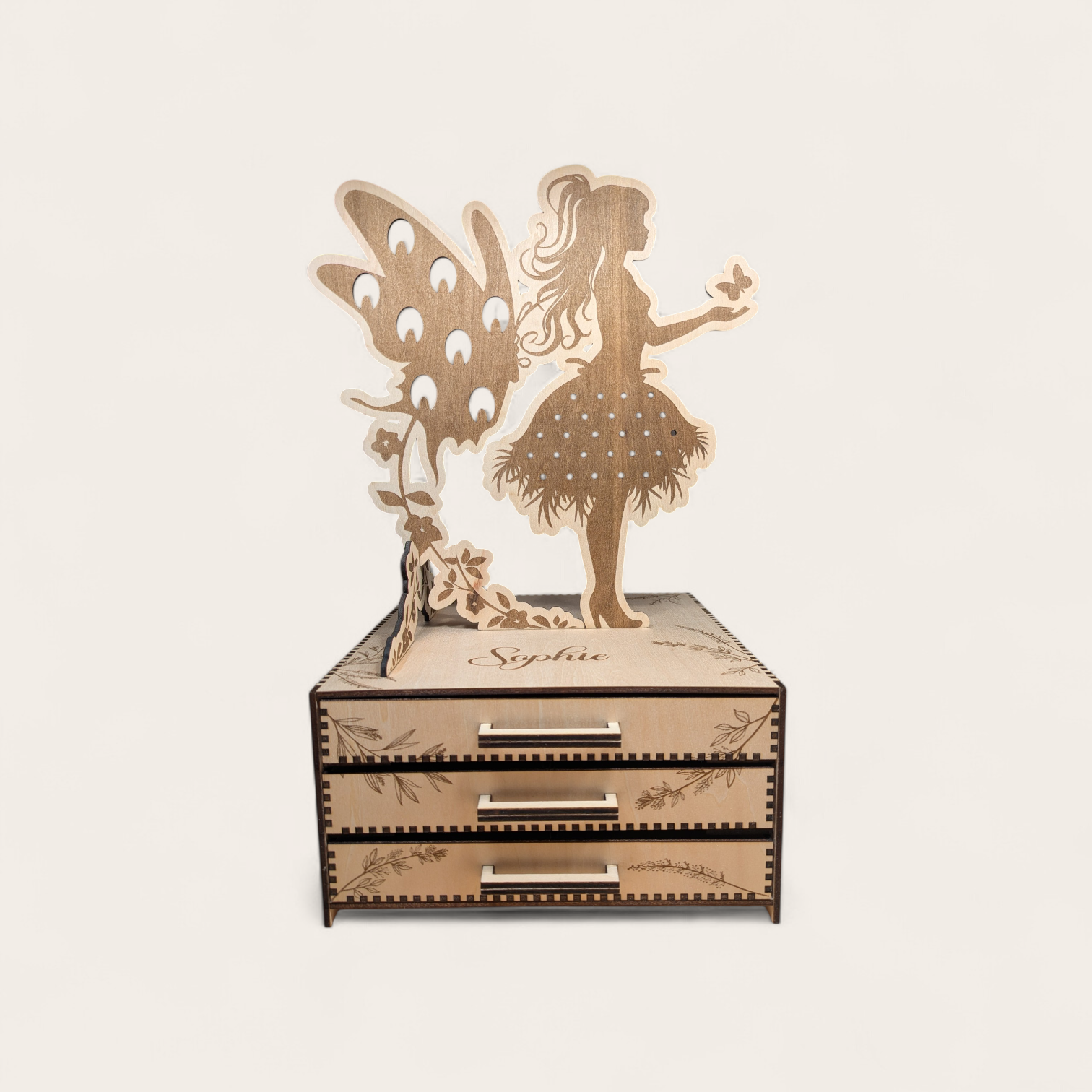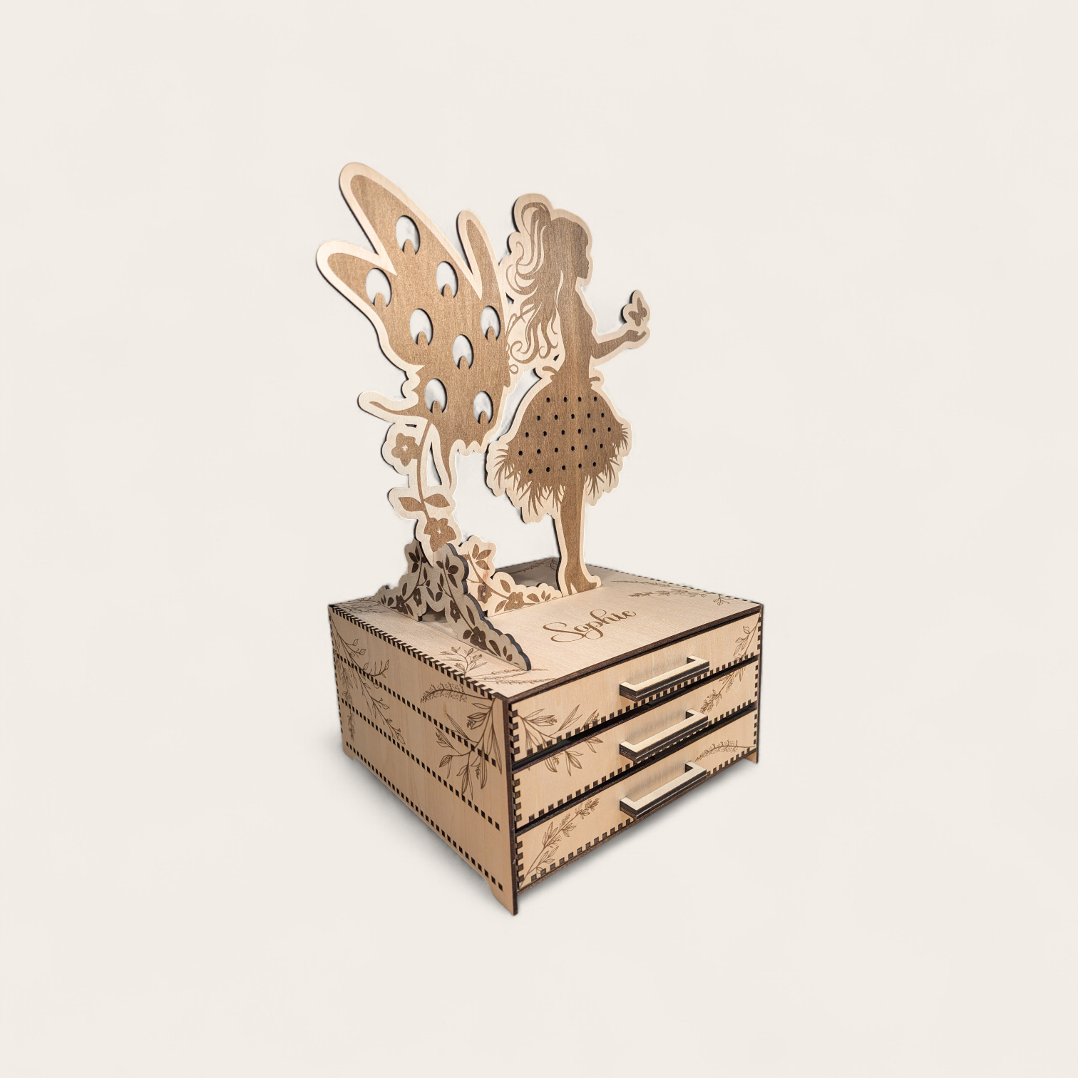 Dieses wunderschöne Schmuckkästchen verfügt über drei Schubladen, die jeweils mit praktischen Einsätzen ausgestattet sind: Die obere enthält 16 kleine Fächer, die beiden unteren jeweils vier großzügige Fächer. Auf der Oberseite steht eine filigrane Mädchenfigur, beidseitig graviert, an der Ketten und Ohrringe stilvoll aufgehängt werden können. Personalisiert wird das Kästchen mit eurem Wunschnamen und wird so zu einem ganz besonderen, einzigartigen Geschenk.